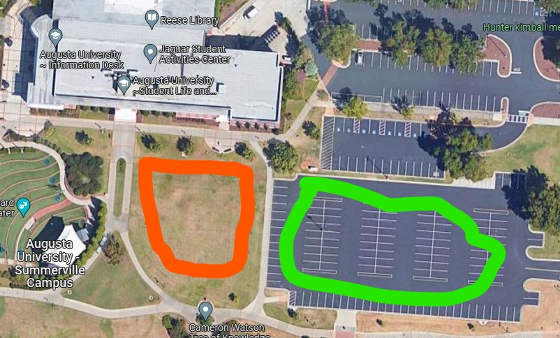 From Walton Way main entrance at Fleming Ave: Go 3 quarters of the way around the circle. The building immediately in front of you is University Hall. Go east (to your right). The road will bend to the south (right). Continue past the Reese Library and turn right into the Jaguar Student Activities Center parking lot on your left. Follow the green line in the image below.